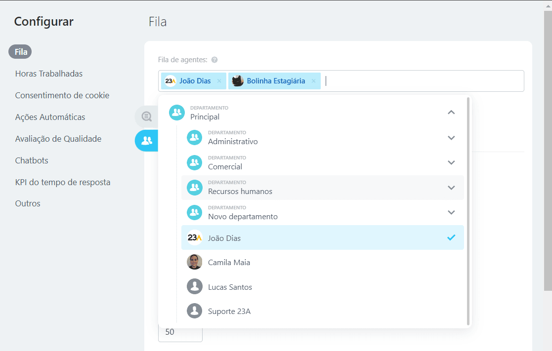 Insira novos agentes na fila clicando em “Adicionar”. Você pode selecionar usuários específicos ou departamentos inteiros. Conclua clicando em “Salvar”.