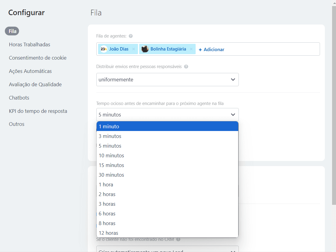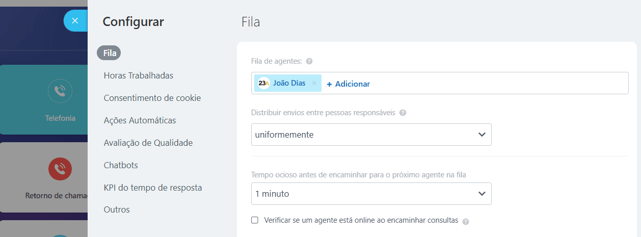 Defina o período antes que o sistema redirecione ou conduza para outro agente e configure para priorizar agentes online, garantindo que os clientes não esperem por alguém indisponível.