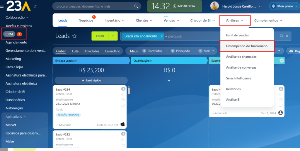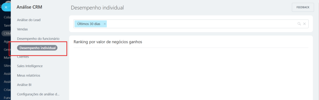2 – Selecione “Análises”: no menu, clique em “Desempenho do Funcionário”.