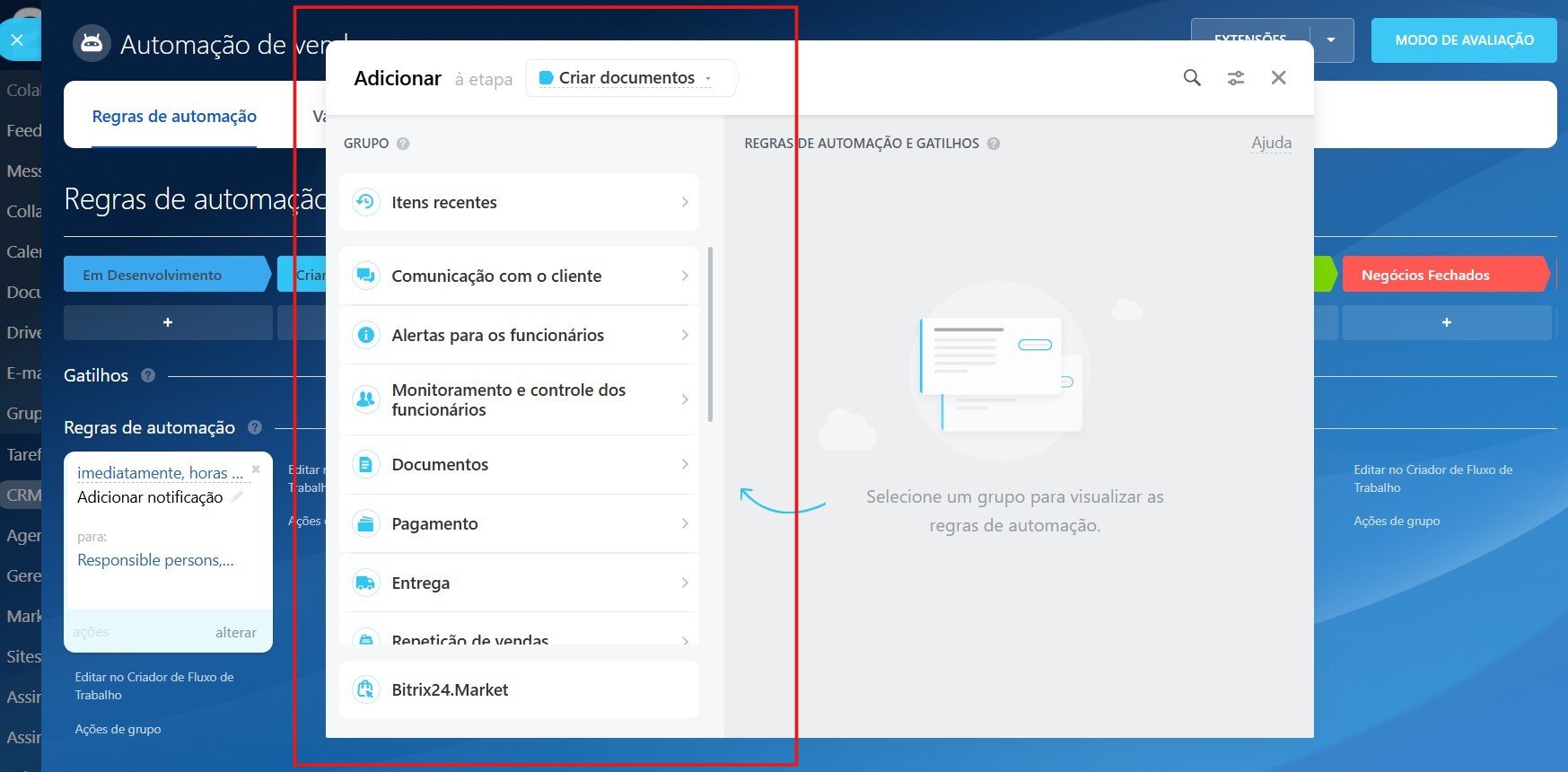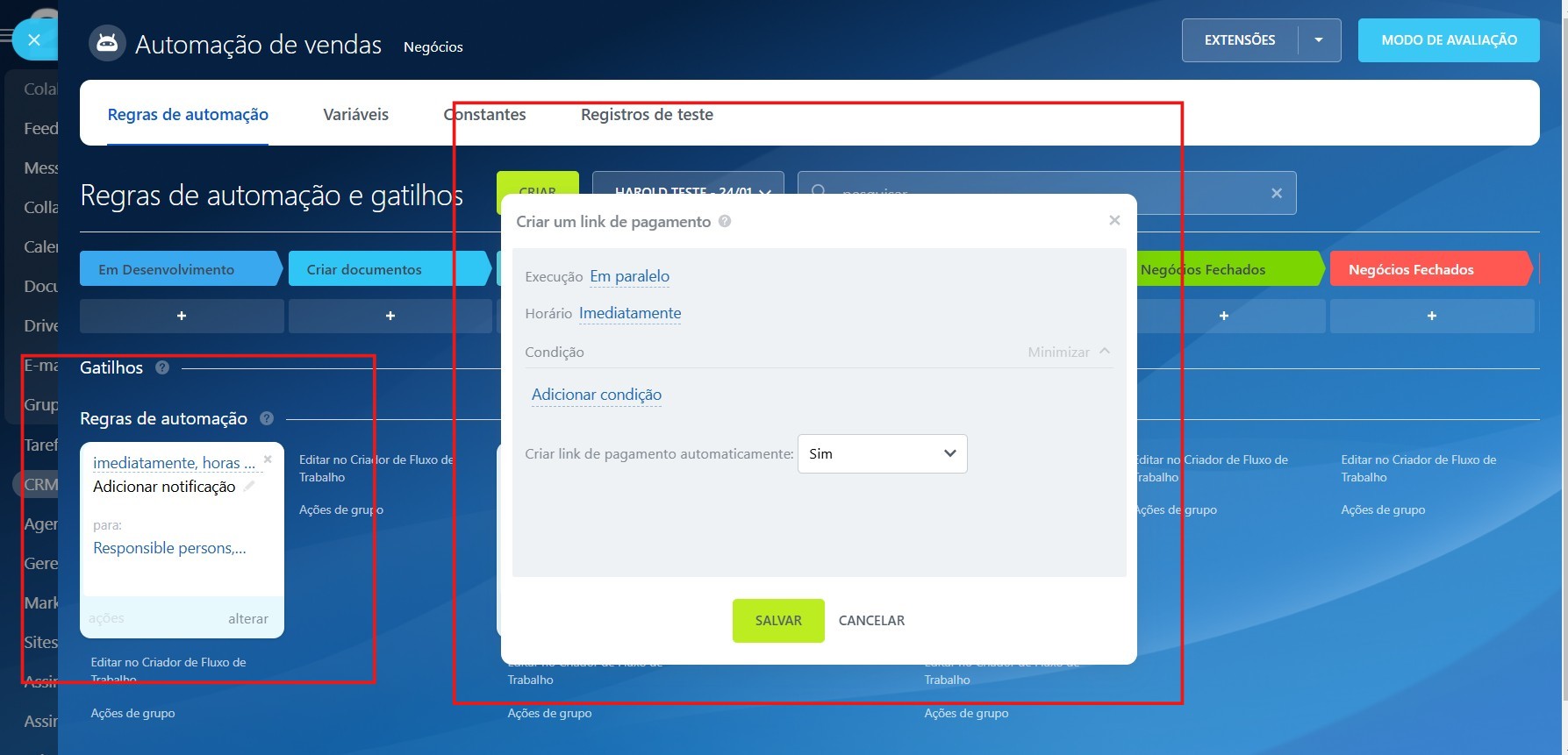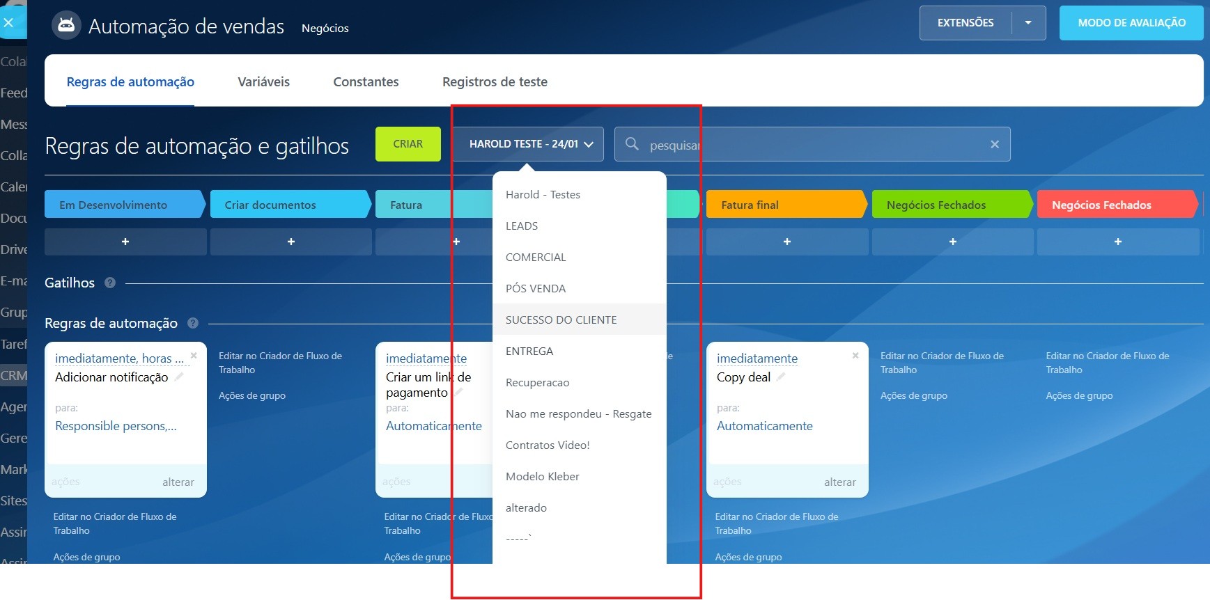 Imagine que um cliente atinja o estágio de “Aprovação do contrato”. O sistema, através de uma regra de automação, gera automaticamente um documento padronizado e o envia para revisão.