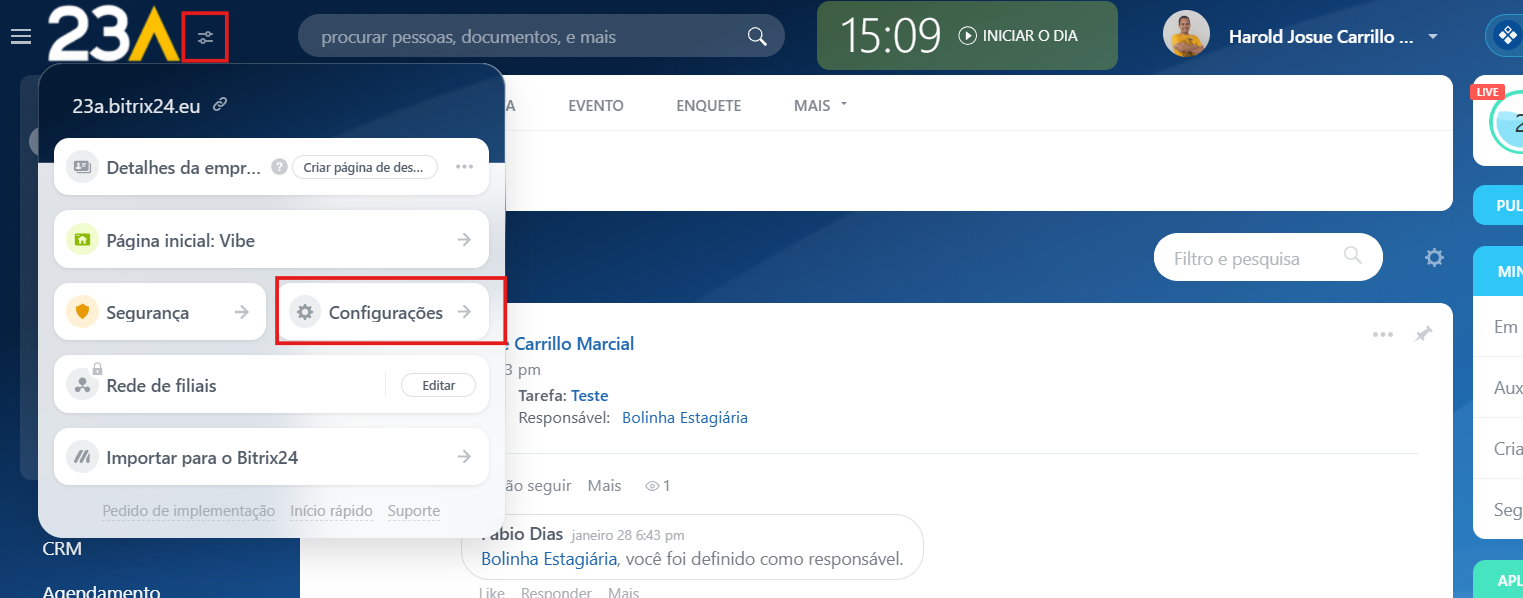 - Na tela inicial do Bitrix24, clique em Filtro > Configurações.