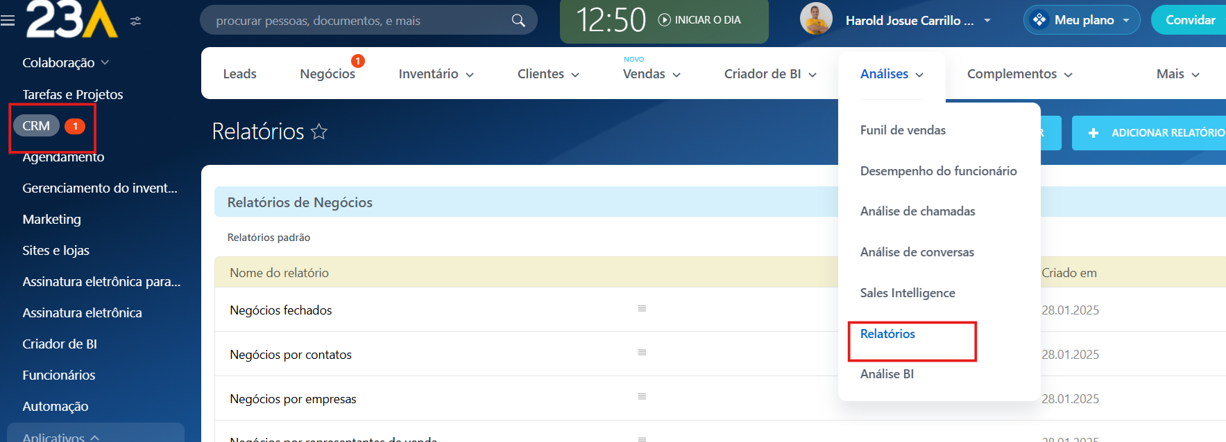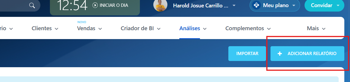 - Acesse CRM > Análise CRM > Gerenciar relatórios.