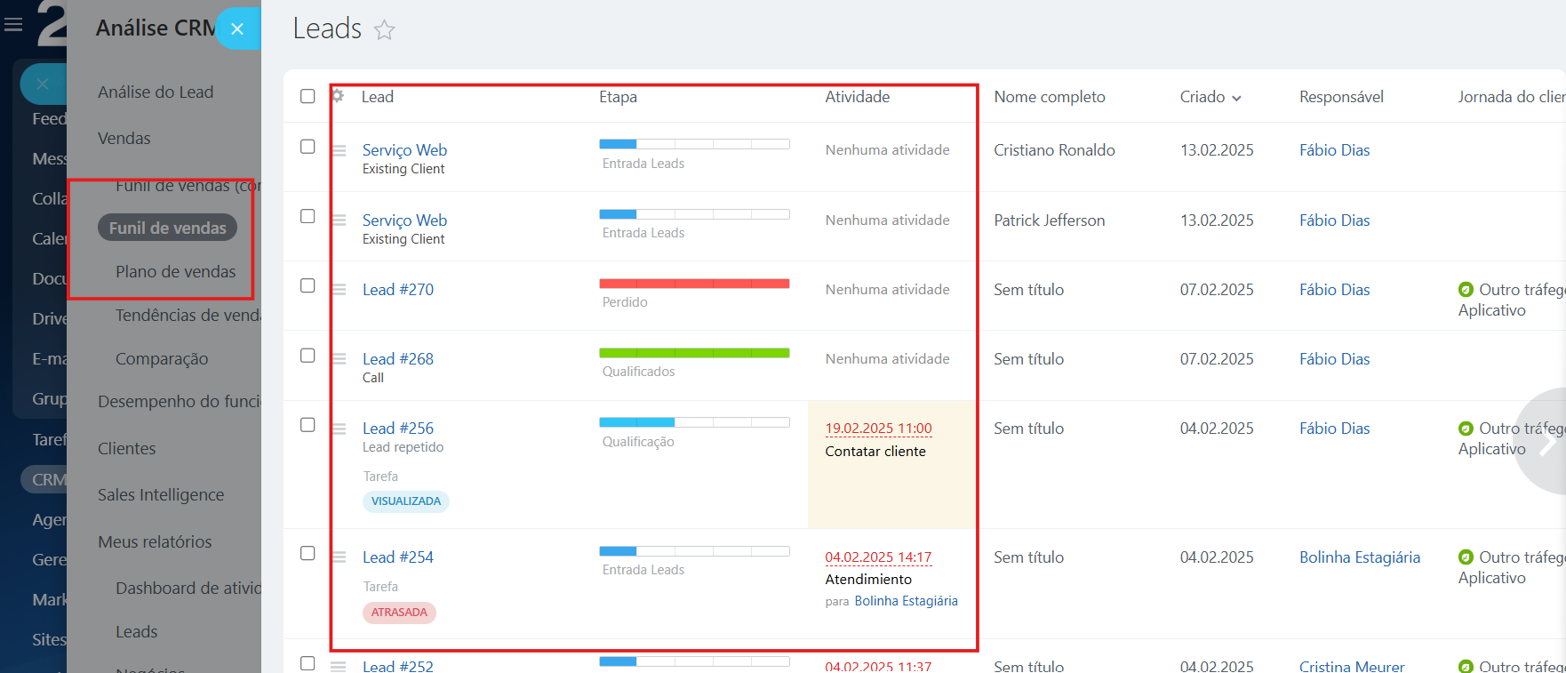 - Clique no nome de uma fase para acessar a lista completa de negócios relacionados.