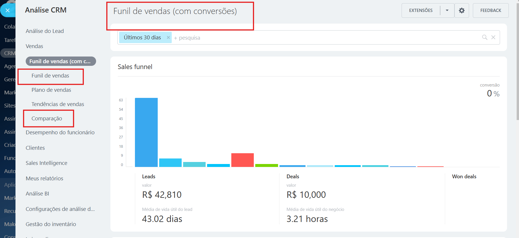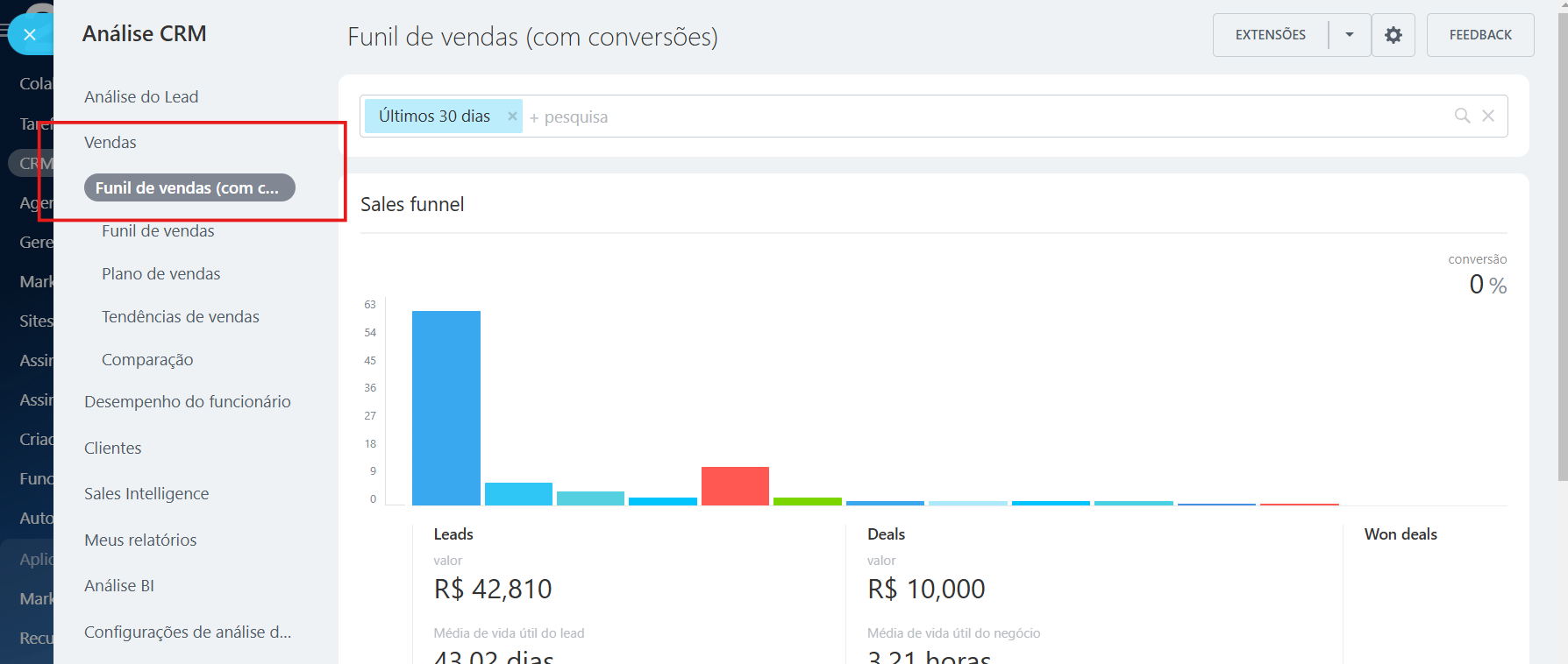 2 – Funil com Conversões: cada fase inferior inclui os negócios dos superiores, ou seja, os negócios ganhos aparecem também nos indicadores iniciais e intermediários.