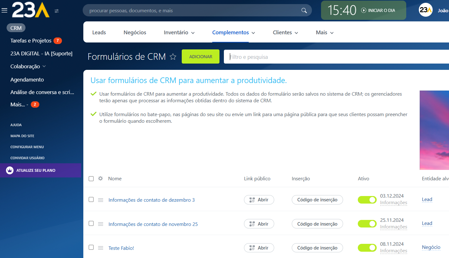Aproveite o suporte 23A Digital gratuito e completo sobre o Bitrix24. Nossa equipe está pronta para explorar todas as funcionalidades dessa ferramenta poderosa. Entre em contato e otimize sua gestão de tarefas agora mesmo!
