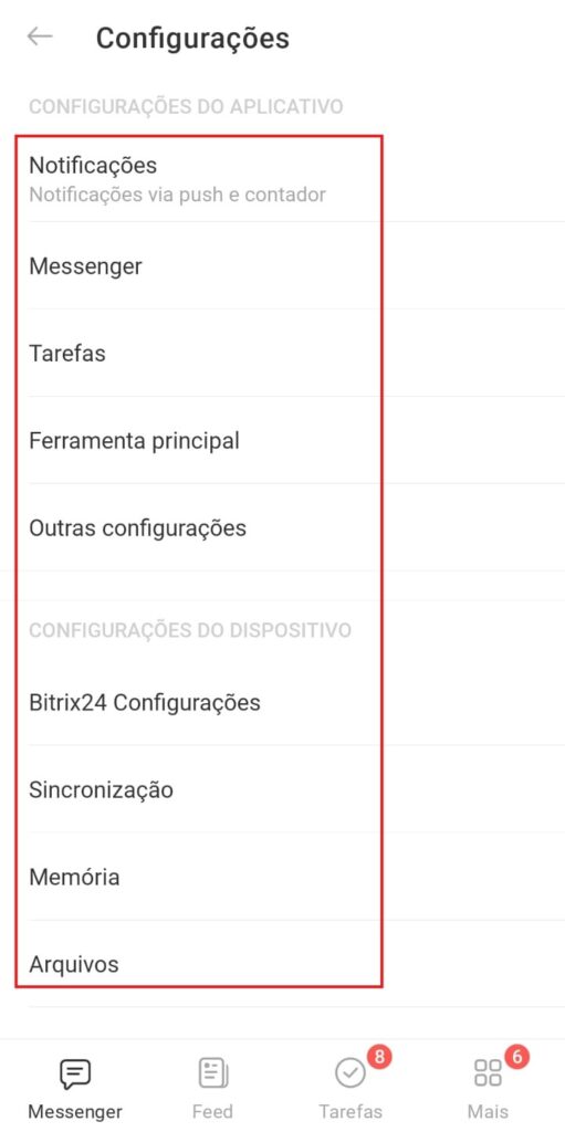• Configurações: personalize notificações, sincronização e preferências gerais;