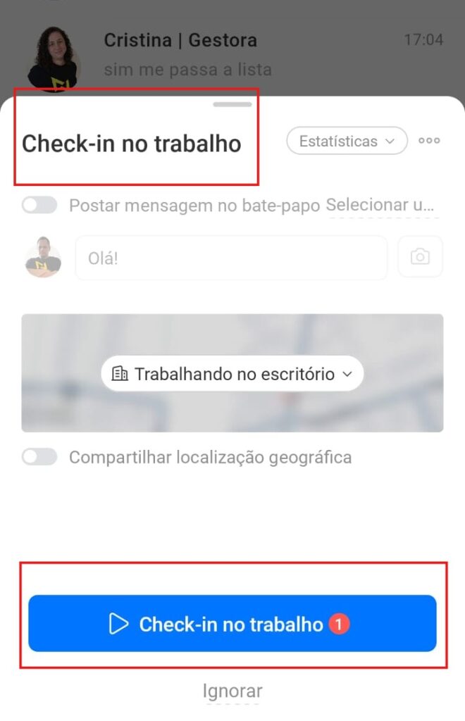 • Check-in: registre sua localização ou horário de trabalho diretamente no app;