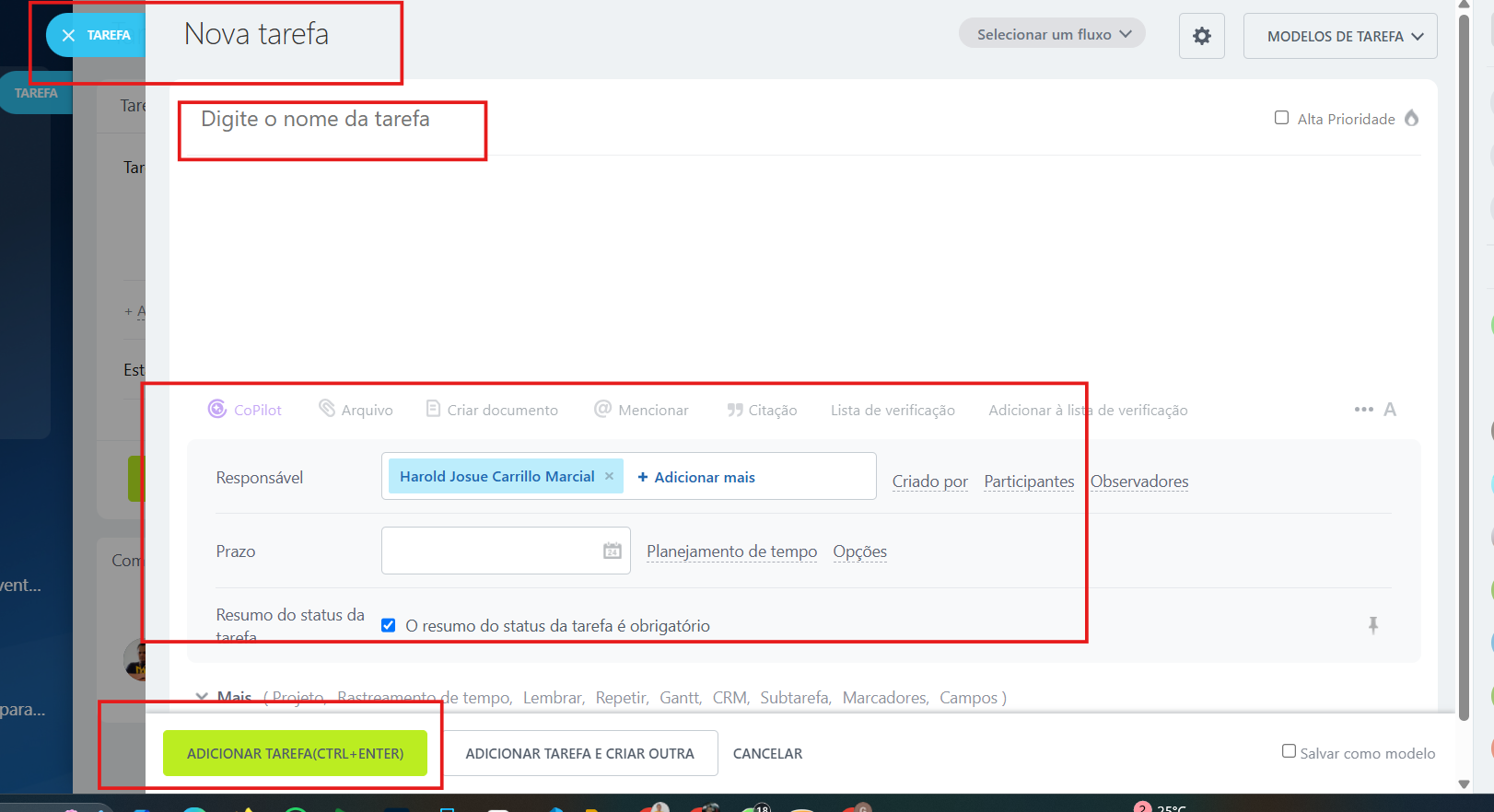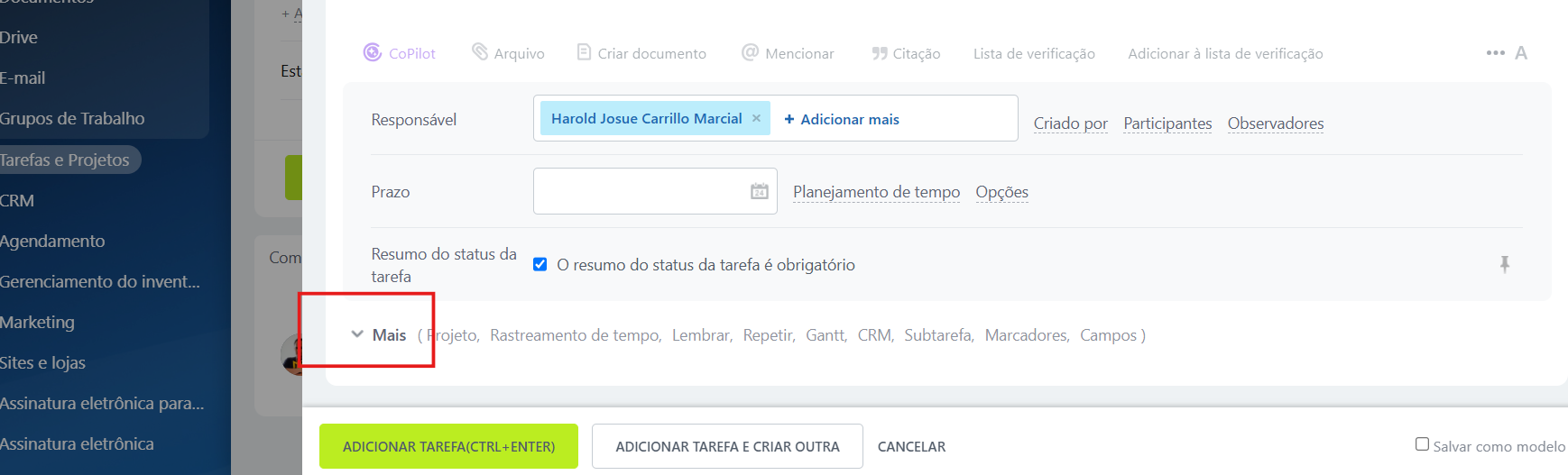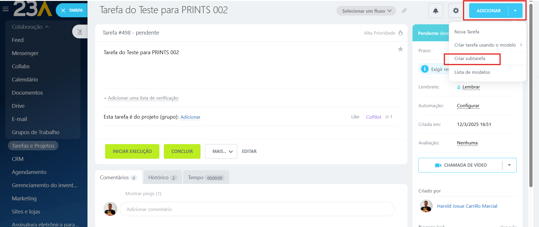 4.- Configure a subtarefa com título, responsável, prazo e demais detalhes.