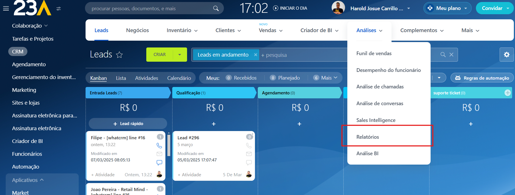 Você pode visualizar quantos leads entram por canal, acompanhar tarefas de follow-up e criar alertas automáticos para contatos que estão parados há muito tempo.