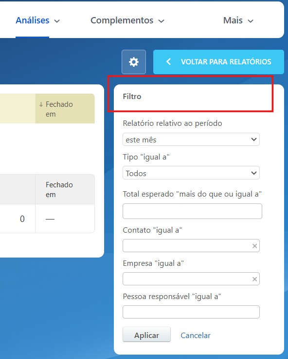 3 – Defina os filtros: personalize seu relatório com filtros como período, responsável, estágio do negócio, etc.