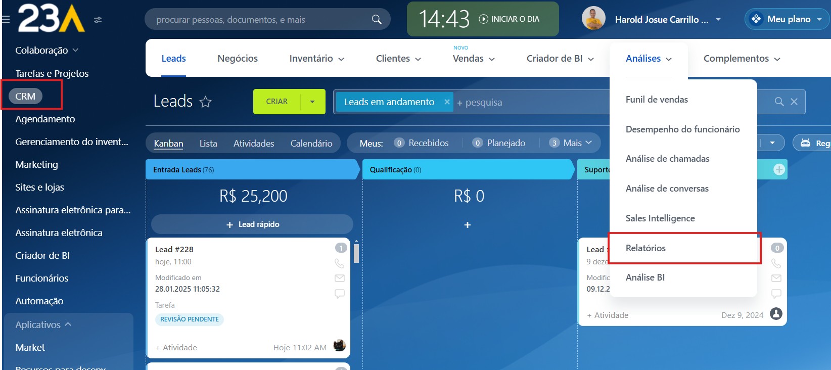 1 – Acesse CRM > Relatórios: encontre a seção de relatórios no seu CRM.